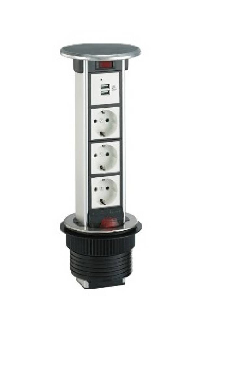 Kolumna wysuwana, IP54. 4 moduły 45x45 mm. Dodatkowe miejsce 1 moduł 45x45 mm. Przycisk ON/OFF. Średnica zewnętrzna 120 mm, montażu 102 mm. Kolor: szczotkowane aluminium. DS.90.01